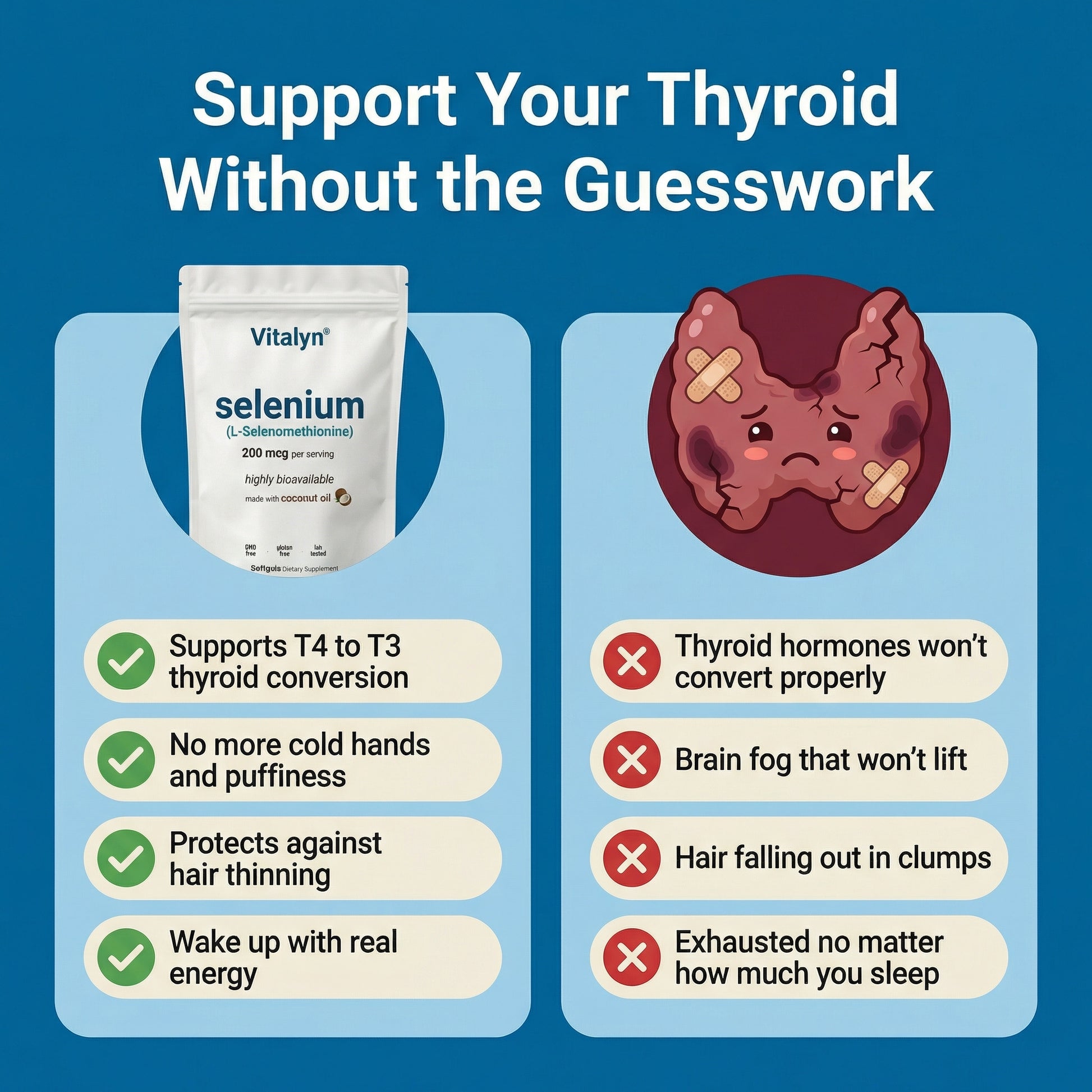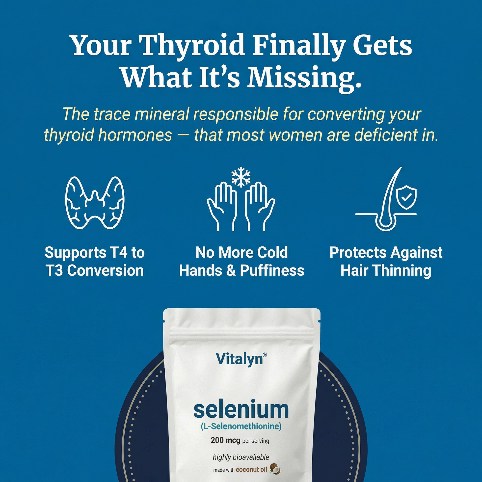 Selenium is an essential trace mineral your body can't produce on its own. Your thyroid contains the highest concentration of selenium in your entire body — it's required to convert T4 (inactive thyroid hormone) into T3 (the active form your body actually uses). Without enough selenium, that conversion stalls and you're left with brain fog, fatigue, cold hands, puffiness, and hair loss. Modern farming has stripped it from our soil, which is why most women are deficient without knowing it.