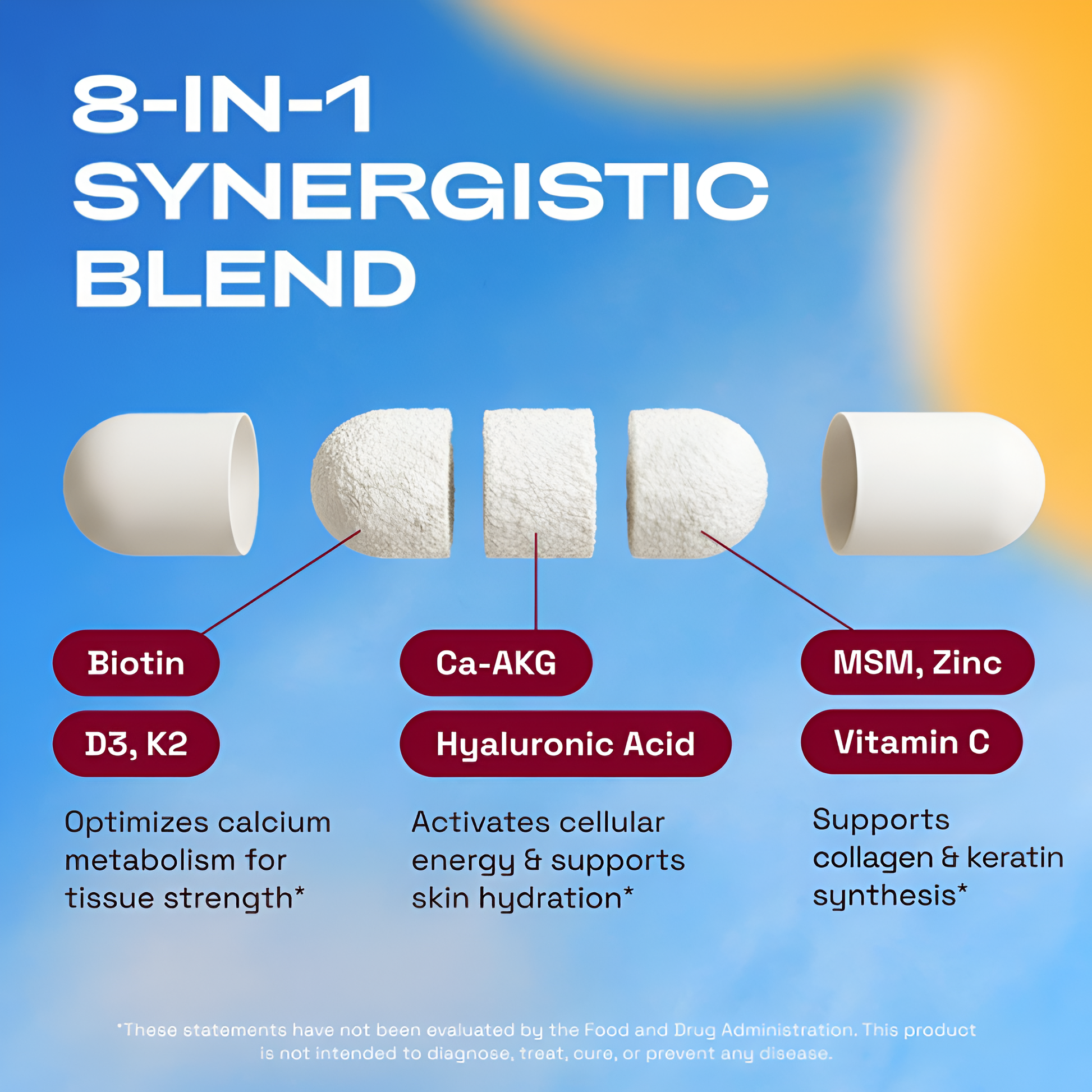 Absolutely. Our formula is designed to support all three — Hyaluronic Acid for skin hydration, Biotin & MSM for hair strength, and CA AKG & Zinc for nail health.